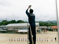 昼休みに開閉会式の練習がありました。応援団の団長による優勝旗返還や授与、選手宣誓、国旗・村旗・校旗掲揚の係の練習、準備運動の練習や校歌の指揮の練習など、朝礼台周りで一斉に練習していました。練習後ものすごい雨が降ってきました。練習中じゃなくてよかった。 |