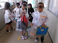 ハッピーハロウィン! 赤阪小学校にも小さな仮装した子どもたちが休み時間ごとに校舎内にあふれ、「Trick or Treat」と言いながら先生たちにシールやサインをしてもらっていました。どの子もかわいくしっかり言えていました。 |