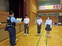 | 今朝の朝会で、富田林警察署赤阪駐在所勤務の警察官のかたに来ていただき、交通安全に関する表彰を受けました。 大阪府では、毎年全国ワーストになる死亡事故等が起きていますが、千早赤阪村では交通事故発生件数が少なく、交通安全への意識が高いようです。またそんな中、本校の生徒の登下校の様子について、自転車通学の生徒はきちんとヘルメットをかぶり、道路の左端を運転していて、二段階右折等の交通ルールもしっかり守れていることなどが評価されました。生徒会が代表して表彰状を受け取りました。 賞状と盾は、皆が見やすい玄関等に飾ろうと思います。記念品として頂いた今治タオルは保健室で活用します。 2時間目、女子の体育で剣道をするというので少しだけ見に行きました。剣道は武道なので礼に始まり礼に終わるものです。しっかりと心が鍛えられるといいですね。 |