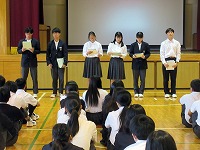 | 1時間目集会がありました。 委員会の前期活動報告がありました。学校の為にいろいろな活動を頑張ってくれていました。ありがとうございました。生徒会は活動報告で、ラオス支援で提供した文房具類の報告をしてくれました。それから、一人一人の感想を言ってくれました。成長したことを実感できてよかったです。後期生徒会はペットボトルキャップを集めるようです。ご協力お願いします。 |