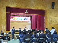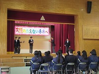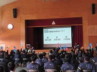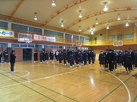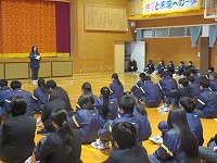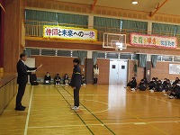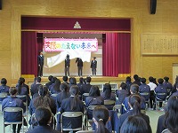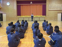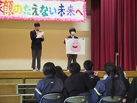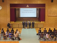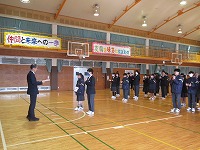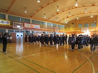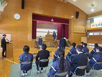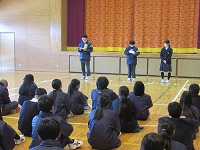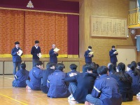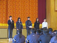 | 3学期最初の全校朝会でした。生徒会から週予定や週目標の紹介がありました。今週は1・2年生が英検受験を予定していることと繋げて、「気を引き締めて勉強しよう」という呼びかけがありました。その後、校長講話、ポスターや意見文のコンクール入選者の紹介や表彰をしました。 | ![]() ![]() |