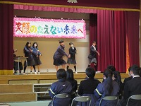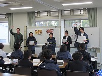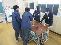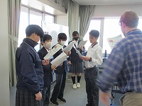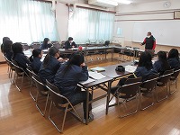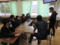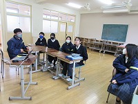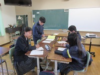 | 今日は3月並の陽気とのことで、昼間はかなり暖かくなりました。 昼休みには、外で散歩したりサッカーを楽しんだりしている生徒もいました。また、「3年生を送る会」に向けて、実行委員企画担当による話し合いもありました。この「送る会」のことは先月の生徒総会でも話題になっていましたし、大事な行事だと在校生が思っていることが、伝わってきます。 | ![]() ![]() |