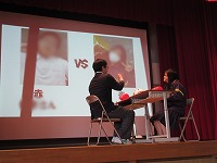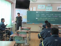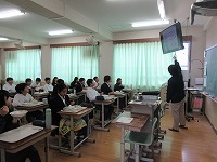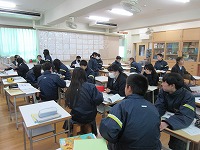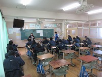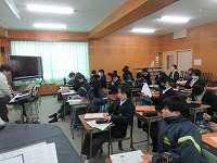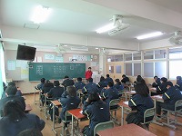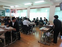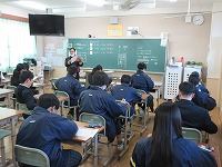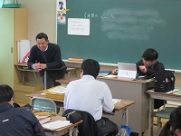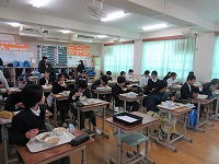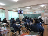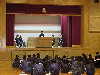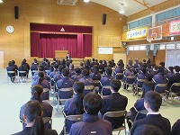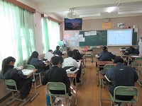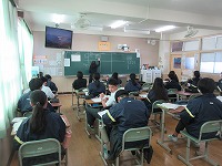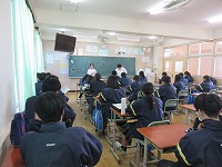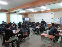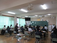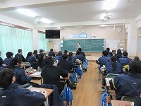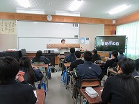 | 2年生は進路について考えていました。 「自分がしたいことは何なのか?」をもとにして、自分の将来を考えることが大切なことなどの話をとても集中して聞いていました。 |