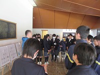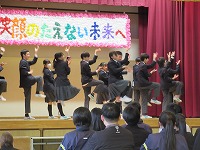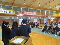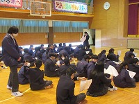 | 寒さが和らいだ中での全校朝会でした。生徒会から、来週の1・2年の学年末テストに関する週予定や週目標のお知らせがありました。また、選挙管理委員会から、次年度前期生徒会役員選挙への立候補を募る告示がありました。今の本部役員がすっかり慣れて今日の朝会も頑張っていましたが、早いものでもう次への動きが始まりました。 | ![]() ![]() |