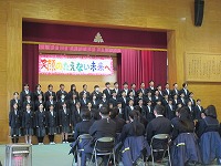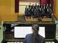 | 4限、1階の職員室へ歌声が降ってきました。3年の音楽です。音楽室は職員室から遠いのですが、この時間は、第1・第2学習室にも分かれてそれぞれのグループで、卒業式に向けて歌の練習をしていたのでした。3月13日が卒業式ですので、3年生が登校するのは、今日も卒業式の日も入れてあと17日間となりました。 | ![]() ![]() |