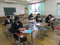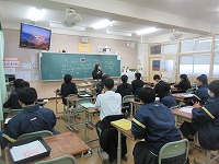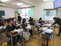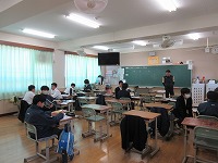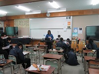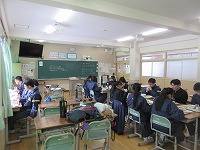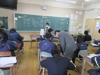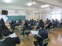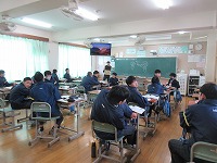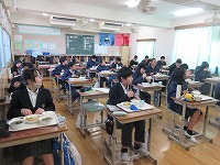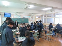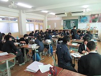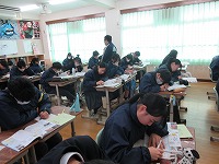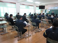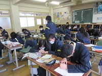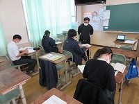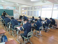 | 1年は英語、2年は音楽、3年は国語の時間の様子です。1年生は「くすのき英語camp」で1日英語漬けを経験してから、英語を使う意識が高まっています。2年生は、卒業式で「歌声を贈る」意味や歌う目標について話し合っていました。多くが来週の私学受験する3年生は、入試を意識して勉強していました。特に3年生は体調管理に気を付けてほしいです。 | ![]() ![]() |