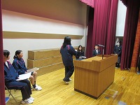 | 次年度前期の生徒会役員立候補者の立会演説会と選挙がありました。会長職も含め5名の1・2年生が立候補しました。選挙管理委員から先に選挙広報が配布され、続いて立候補者が演説しました(応援演説もありました)。それぞれ、自分の持ち味や取り組んでみたいことをしっかり伝えていました。教室に戻って投票(定数ちょうどで新任投票)しました。 | ![]() ![]() |