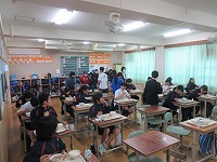 | 今日は学校を準会場として、1年・2年の英検を実施しました。5級から準2級に分かれて受験しました。試験開始後はリスニングテストの時間だけでなく筆記試験の時間も取材に入っていないため、開始前に勉強していたり、問題用紙・解答用紙を配布していたり、志願票に記入したりしているところを紹介します。 | ![]() ![]() |