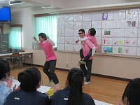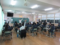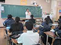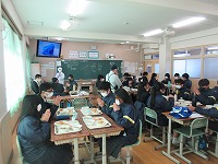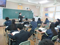 | 2年生は、4限の美術で、来月の茶道体験に向けての学習をしていました。貴重な機会になりますね。給食タイムには、給食時指導がありました。指導栄養教諭が冒頭、さまざまな食材の写真を提示し、共通してよく摂取できる栄養素は何か当てるクイズを出しました。牛乳が登場して「カルシウム!」と確信するまで、迷いながら一生懸命考えていました。 | ![]() ![]() |