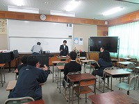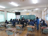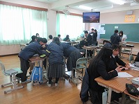 | 今朝もかなり冷え込みましたが学校は再開できました。1年は社会科でフェアトレードについて、2年は男子保健でたばこの害について、考えを比較しあったり、根拠を出し合ったりしていました。女子体育では剣道に取り組んでいました。3年は私学入試を受けに行っている生徒が多く登校したのは若干名で、自習をしたりして3時間過ごしました。明日入試2日目がある人は、もう1日もうひと頑張り! | ![]() ![]() |