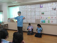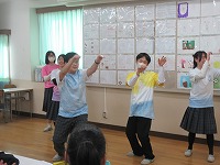 | 今年度も、村の事業として1年生がくすのきホールで、「くすのき英語camp(イングリッシュ・キャンプ)」を体験しました。給食も、センターからくすのきホールに届けてもらって、1日どっぷり英語の世界。全体でアイスブレーキングをした後は、5グループに分かれ、ファストフード店のレジ、ホテルのレセプション、俳優としての演技、3種類の職業体験をしました。続いて、グループ付きの講師の方の出身国について教えてもらました。それを英語で他のグループに紹介するプレゼンテーションをして、1日の活動を終えました。英語だけで一生懸命伝えている姿、協力して練習・発表している姿、ノリよく明るく楽しんでいる姿、1年生の素敵な場面がたくさんありました。 | ![]() ![]() ![]() ![]() ![]() ![]() |