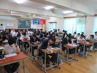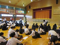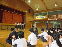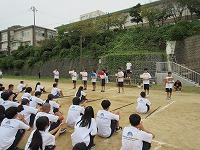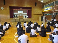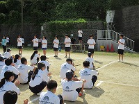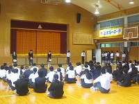今日の全校朝会は、いろいろな内容がありました。 前半は、ふだんのように生徒会から今週の予定と週目標の紹介。そして校長講話(今日が創立記念日であることなどを話しました)。後半は、体育大会に向けて、保健室から熱中症予防の話、応援団の紹介とあいさつ、生徒会種目の紹介とその実演がありました。実演は、見ている方も盛り上がりました! |