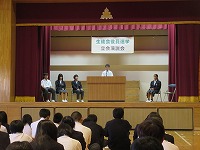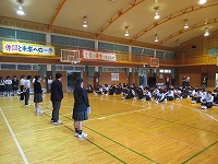 今日の全校朝会は、2日の記事で話題にしていた、前期の生徒会活動を締めくくる「生徒総会」でした。代議員・文化委員・環境委員・保体委員・図書委員から前期を振り返っての報告、後期への申し送りがありました。そして本部役員からも。最後は役員一人ひとりが挨拶をしました。みんなから温かい拍手が贈られました。 | ![]() ![]() ![]() |
