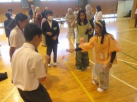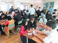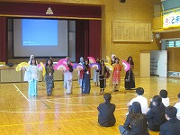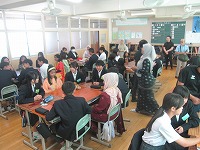 今日は、マレーシアの「SK Convent Kajang」 という学校から、10歳~12歳の学生さん13人が本校を訪問してくれました。村教委からの紹介による大阪観光局を通じての交流機会でした。ふだん頑張っている英語を実際の会話で生かすチャンス。1年生はダンスや昔遊びを通して、2年生は教えてもらった名前について、日本語での書き方を紹介しながら、3年生は折り鶴を作る説明をしながら、英語が伝わる喜び、うまく言えないもどかしさを、味わえていました。「トゥリマ・カシ(ありがとう)!」 | ![]() ![]() ![]() ![]() |