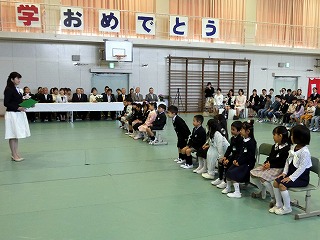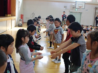 今日の朝礼は、1年生が全校の前で 「私の名前は〇〇〇です。△△と呼んでください。すきな食べ物は◇◇です。」 という紹介と今年度のなかよし班の顔合わせ、 そして5月10日の全校遠足に向けての話し合いをしました。 1年生の紹介の後、2年生からアサガオの種をプレゼントしてもらった1年生、もうすぐ生活科でアサガオを植えますよ。