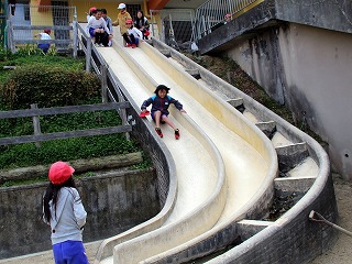 本校は下足室が2階フロアにあって、そこから運動場まで降りるすべり台があります。 石のすべり台はよくすべります。でも正しく使わなければケガをしてしまいます。1年生には、毎年正しいすべり方を教えてからすべっていいということになります。 今日は、本校に4月に赴任した阪上先生が挑戦していました。(^O^)
