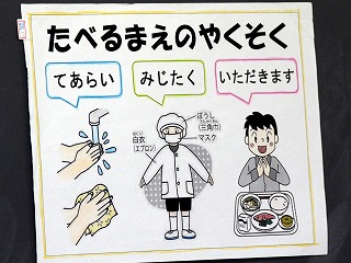 1年生は、今日から給食スタートです。食べる前には、きれいに手を洗って、マスクをして、当番はエプロンを着けて配膳です。 今日のメニューは、ケチャップフランクとキャベツのカレーソテーをコッペパンにはさんでホットドッグにして食べます。 みんなは、とてもおいしそうにパンにかぶりついていました。栄養教諭の阪本先生には、給食センターの紹介や苦手な食べ物が出たときのことなどを教えていただきました。 話もしっかりと聞いて、とてもお行儀良く食べていました。 給食センターのホームページも見てください こちら