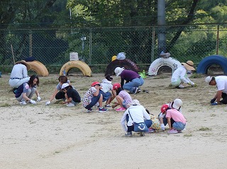 いくぶん気温が下がったとはいえ、大変暑い中、たくさんの方にご来校頂き、運動場の半分が草だらけの状態でしたが、きれいに草を抜いて頂きました。また、運動場を囲むように溝があるのですが、そこに流れ込んだ土が泥状になったものを溝から上げるという重労働もしていただきました。ほんとうにありがとうございました。2学期から始まる運動会の練習も気持ちよくできそうです。