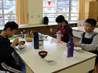 | 5年生は、家庭科の調理実習で、「ごはん」と「おみそしる」を作りました。家庭科支援ボランティアにも多数お越し頂きましてありがとうございました。ごはんが炊ける様子がわかるようにと、強化ガラス製の鍋を使用しました。また、お味噌汁のだしは煮干しからとりました。