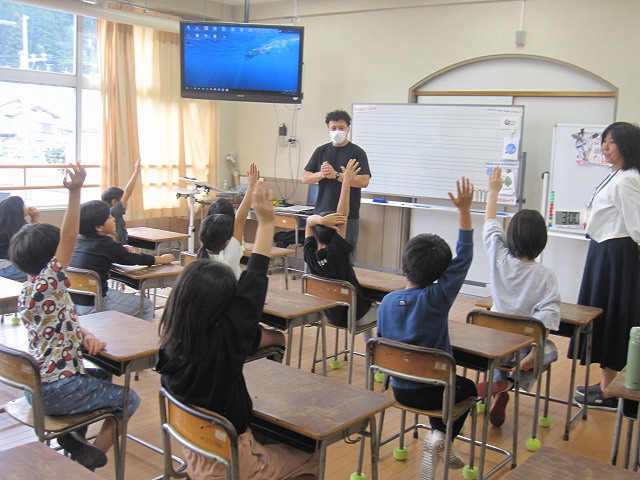今日の給食のメインは「焼きさんまのおろしじょうゆ」ということで、給食センターから栄養教諭が来てくださり、1年生に上手な食べ方を教えてくださいました。