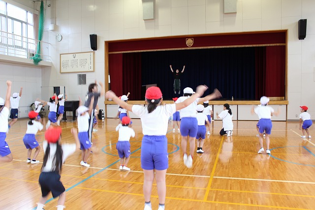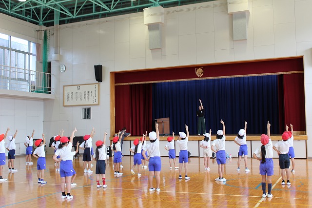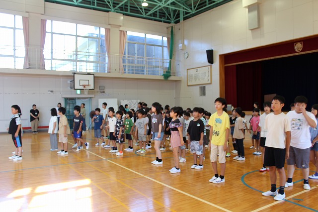 今朝は体育館で、児童朝礼がありました。