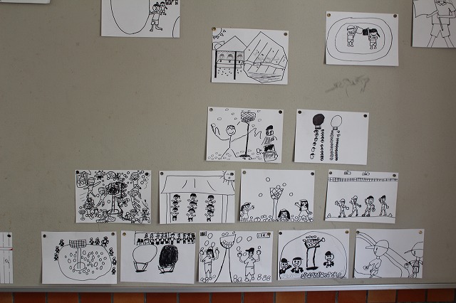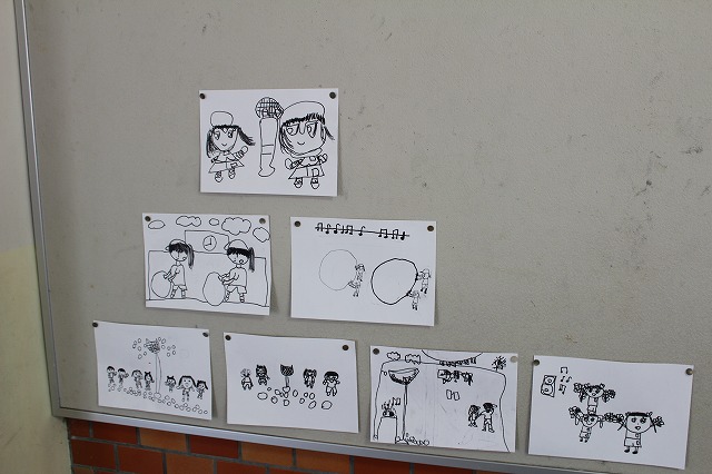 児童が描いた運動会のイラストを、玄関に掲示しています。