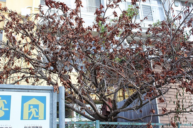 正門付近の八重桜は、立ち枯れてしまいました。